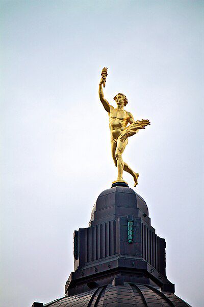 The Golden Boy was modelled on Giovanni da Bologna’s 16th-century sculpture of the Roman messenger god of trade, profit and commerce, Mercury. The sheaf of wheat in the statue’ left arm represents the fruits of labour, while the torch in its right hand represents a call to youth to join his eternal pursuit of a more prosperous future. The statue faces in a north direction, pointing towards the Manitoba region to symbolize its importance as a provider of important natural resources and economic opportunity.